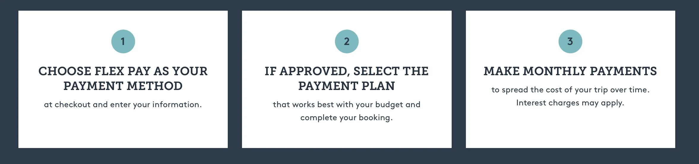 Flex Pay gives you the freedom to book travel now and pay over time with simple fixed installments. Some plans include interest while some are interest-free. When you’re ready to check out, just select “Flex Pay” as your payment method, complete a short application, and receive a quick decision. Choose the terms of your payment plan, finish checking out, and enjoy your purchase. Then, pay over time with simple, no-surprise monthly payments.