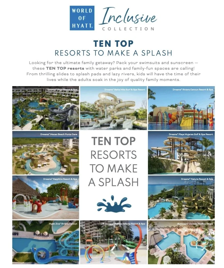 Introducing the TEN TOP content series that spotlights TEN of the TOP features or themes of Inclusive Collection resorts! There are so many special reasons to travel that Hyatt wants to feature these unique and special offerings that the Inclusive Collection resorts. Want to know about these TEN TOP series of golf destinations, luxury moments, rooftops, and more?! Contact me - Hyatt will release a new TEN TOP series every month!